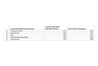 The following chart shows the Top 5 least important amenities according to U.S. travelers who most often book hotels when they travel. Additionally, respondents representing hotels gauged how important these same amenities are to travelers. Their answers are displayed below: