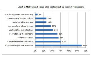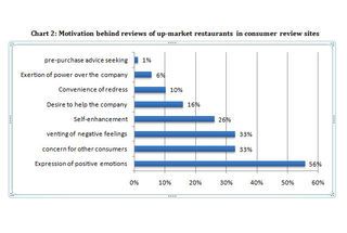 Recent research at Lausanne Hotel School investigates the content of blogs and consumer review websites in up-market restaurants in Singapore. One key finding shows that the majority of the reviews and blogs are positive in nature, proving that social media is mostly advantageous to these restaurants (see chart 1 and 2 below). Additionally, online content related to high-end restaurants’ focuses more on service, the chef and portion size in comparison to low-end restaurants, where content focuses on price, speed and location. The findings suggest that the main motivations of posting online word-of-mouth about restaurants are to express positive emotions, to benefit other consumers, to achieve “expert status”, to help the company and to vent negative feelings. Motives such as achieving social benefits only apply to blogs and advice-seeking motivations (pre-purchase, as post-purchase is less applicable for restaurants) are more prevalent in up-market restaurants’ reviews websites.
