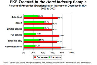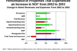 In 2003, 34.5 percent of the hotels that participated in the Trends® survey achieved a gain in NOI. This compares to an all time low of 25.1 percent in 2001, and an increase to 32.9 percent in 2002. In aggregate, the properties that achieved growth in NOI in 2003 enjoyed a 14.9 percent increase in profits. This compares to the overall Trends® sample that suffered a 12.4 percent decline in NOI from 2002 to 2003.