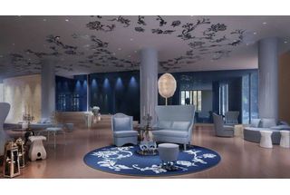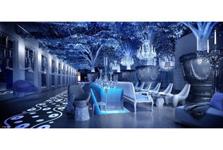 As guests enter Mondrian through a lush green garden topiary facade on Crosby Street, the story of "La Belle et la Bete" is unveiled in the lobby: a powdery French blue color palette unifies a series of seating vignettes over a pale oak floor. The casual and eclectic seating groups featuring custom furniture designed by Noriega, echo the whimsical environments of other signature properties within the Morgans Hotel Group portfolio.