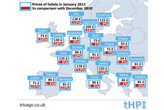 London, January 18th, 2010. Hotel prices in the UK have fallen in January, in line with expectations of price trends following the holiday season. Nevertheless, year-on-year comparisons show that UK prices are on average 14% higher than in January 2010, and many of the largest cities have experienced even larger increases in accommodation costs. The European average has fallen 2% to 88 pounds, and 29 of the 50 top cities in the tHPI are offering cheaper rates than in December.