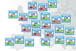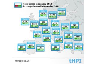 Compared to last month, European hotel prices have dropped in January by around three percent to 88 pounds. The Greek capital Athens has dropped to 63 pounds (down one percent from last month), the lowest figure since recording the tHPI (May 2008). With an average of 135 pounds, the hotel industry in London reports the lowest price for an overnight stay in a standard double room since February 2011, a 13 percent drop in price compared to last month. In Barcelona, overnight rates reached their lowest level since December 2009, reporting 80 pounds per night- seven percent lower than the reported rate in December 2011. Even Rome (£89, down seven percent), Istanbul (£ 79, down seven per cent) and Amsterdam (£ 99, minus five percent) recorded their lowest accommodation prices since February 2011.