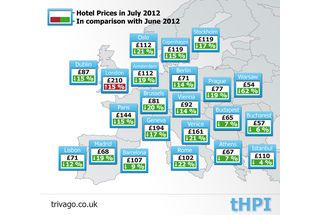 Whilst London hotel prices have risen 15 percent during July, elsewhere in Europe prices have decreased dramatically in comparison to June 2012. Out of the 50 major cities listed in the July tHPI, London is the only city with an average overnight accommodation price increase.
