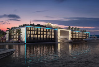 The main building of this floating palace, structured in four parts, is connected in the middle by a glass pyramid and offers every luxury of a 5-star hotel, from exclusive gourmet restaurants, bars, spa, pools to boutiques, banquet areas and the possibility for even larger yachts to sail in and out at the centre of the hotel.