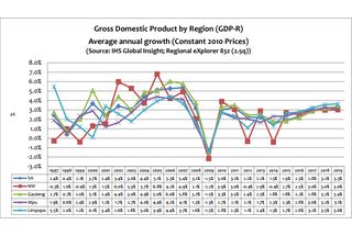 The below chart illustrates regional GDP growth for the years 1997 to 2019. The trendline for the Gauteng economy is depicted in red.