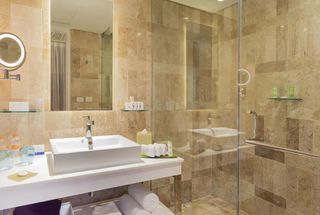 Marble floors throughout the suite lead to the modern bathroom, featuring a rain shower and Thierry Mugler bathroom products. Other amenities include a 50-inch TV, WIFI, 24-hour room service and minibar.