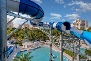 Water Slide Tower - Designed by WhiteWater, the 60-foot water slide tower features seven slides: the Constrictor, a 558-foot slide for 1-2 riders on rafts; Master Blaster, a 486-foot slide for 1-2 riders on rafts;Boomerango, a 377-foot slide for 2-4 riders on rafts; Whizzard, a 266-foot two-slide single rider mat racer slide; and two Aqua Drop body slides, 348 feet and 286 feet respectively.