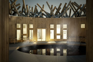 The circular-shaped Arctic Bath houses one spa treatment room, four saunas, an outside cold bath, a hot bath, outdoor and indoor showers, and two dressing rooms. The open center of the bath invites guests to sunbathe, ice bathe or sit back to view the Northern Lights or star-filled skies. A dip in the bath itself is consistent with the Arctic tradition of a cold-water plunge with the water maintained at 39 degrees Fahrenheit and combines well with the warmth of a sauna and spa. A special technique has been developed to keep the center of the bath open during wintertime, adding to the drama of the setting and the guest experience.