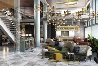 The interior design was overseen by Dutch firm HDVL and blends a sleek, modern aesthetic with standout design features referencing the bold architecture of the reconstruction period in Rotterdam. A color palette of greens and yellows blends with classic materials such as marble, wood and brass throughout the property, evoking the flair and freedom of the 1950's. The Slaak Rotterdam embraces the grandeur of '50's culture in Rotterdam and pays homage to the historic time period with its concrete parasol-shaped entrance area, raw brick surfaces, large open spaces, natural stone and use of mosaics. While the expansive, characterful lobby welcomes guests upon arrival, a stunning bronze bar is the centerpiece of the hotel's captivating design.
