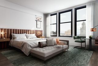 Surety Hotel's elaborate Beaux-Arts facade is complemented with renewed present-day interiors and its design muse was a businessman set in the 1920's. Inspired by the fashion of guests during that era, the color palette features cognac brown hand applied suede plaster walls, green and burgundy leather furnishings, heathered tweeds, and copper, zinc, and black accents. With original maple wood flooring and natural light streaming through large windows, the understated guestrooms were simply designed in contrast to the richness in architecture of the bank building. The new hotel guestrooms evoke a humble yet sophisticated design: simple, contemplative, unadorned confidence. The bathrooms' marble hexagon tile flooring harkens back to the building's original design and features a forest green-tiled accent wall in the glass-enclosed showers. In addition to the 126 guestrooms, nine corner studios overlook the county courthouse, which is listed on the National Register of Historic Places. The Marchande Suite, the hotel's presidential suite whose name nods to the building's French influence and banking past, features a large living room space, kitchenette and bar.