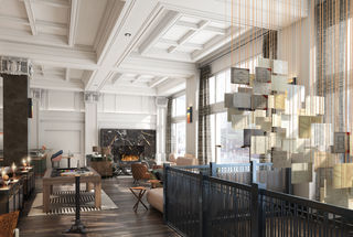 The large, open lobby, serving as the hotel's "living room," encourages guests to gather and features original vaulted coffered ceilings and ground-glass skylights that once looked down upon the former bank space. In the lobby lounge, Surety will serve as a daytime coffee parlor that transforms into an evening destination for cocktails and wine.