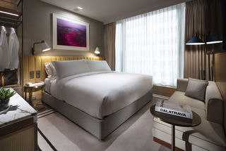 A dramatic open plan is employed in the standard King Rooms and Twin Rooms, allowing a two-seater sofa to be included in every room. The fluted bedhead is finished in a deep amber textured fabric, while the bathroom is finished in a rich marble with a bold green vein. Antique brass elements frame the bathroom mirror and the structure of the wardrobe.
