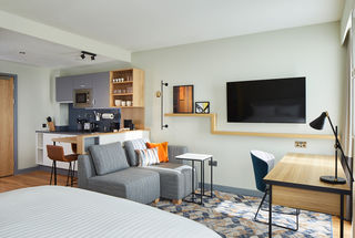 Whilst each hotel has its own entrance and reception, the dual-brand concept lets corporate and leisure guests choose the space that best fits their travel needs, while encouraging them to take advantage of both hotels' shared facilities. These include six meeting rooms and four larger interconnecting event spaces, a well-equipped 24/7 fitness studio and a ninth floor Residence Inn outdoor terrace. Guests can also choose between the ground-floor Moxy Bar and the Residence Inn Bar & Lounge, which serve meals and drinks throughout the day and night.