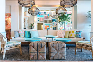With 122 rooms, many with stunning floor to ceiling windows and dramatic views of either Kaimana Beach or Diamond Head, Henderson Design Group took full advantage of the mid-century architecture. Five new suites on the top floor of the hotel are completely reimagined and are sure to be the most requested accommodations. The Pacific Suite is 838 square feet of island-style living featuring palm print and shibori wallpapers, bright pillows in a rainbow of fabrics and comfortable furnishings that make any hour, happy hour. All of the hotel's ocean view and ocean front suites boast oversized balconies that appear to float above the Pacific Ocean and provide the perfect respite to watch the sunset, sunrise and take a break from working remotely.
