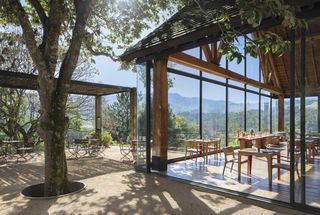Mina, the resort's signature restaurant, offers modern, contemporary Brazilian dishes and 180-degree views of the mountains and valleys, with the suspended fireplace warming the dining room and rich wood floors underfoot.