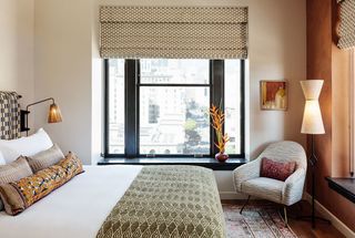 Deeply residential in feel, each of the 148 rooms and suites has a story of its own. Curated vintage pieces are mixed with specially designed furnishings, hand-applied plaster detailing, a warm palette of charcoals and mauves, and richly woven textiles. Standing out are the Proper Basketball Court Suite and Proper Pool Suite. The former reimagines the building's vintage court by elevating original details like painted court lines and double-height ceilings through a luxurious floor plan with sleeping, living, and dining areas, Spanish-influenced interior design, and sweeping city views. The latter pays homage to the building's heritage by placing the original 35x12-foot indoor swimming pool in the center of a one-of-a-kind living room, where it's surrounded by Portuguese-inspired marble and stonework as well as a mosaic mural by L.A. artist Ben Medansky. Each room is outfitted with Aesop bath amenities, custom Kelly Wearstler x Parachute Home robes, and state-of-the-art conveniences, including the Proper App to customize in-room experiences and Vifa speakers.