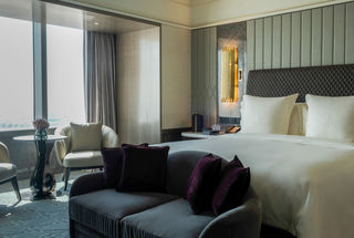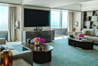 Each Royal Suite is laid out for spaciousness and comfort, stretching 240 square metres (2,595 square feet) and looking out onto panoramic views of the city. The primary bedroom houses a king-size bed with an extensively padded headboard, marble-topped bedside tables, tufted-and-stitched leather upholstered love seat and more. Soothing illumination from lamps and natural sunlight give the space a warm and inviting glow.