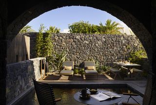 The lobby's elegant domes and arches, a gentle nod to Santorini's prevalent architectural theme, are combined with natural materials such as wood and stone (in the form of embossed walls), providing an earthy ambience that makes guests feel instantly welcome. The use of domes is also apparent in the interior of the generously spaced 103 rooms, suites, and villas that range from a superior room with a king bed to the presidential suite with a private plunge pool.