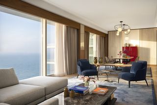 Among the property's highlights are 56 suites of unprecedented grandeur, with magnificent views of the Mediterranean Sea and floor-to-ceiling windows that allow guests to soak in the natural light of the region. It includes the property's triplex-penthouse suite, the largest of its kind in Tel Aviv and spanning more than 370 m2 with panoramic sea views showcased through six-meter floor-to-ceiling windows. The penthouse includes two bedrooms with ensuite bathrooms, living space and dining room, a gym, and a private terrace with a 10-meter infinity pool that melts into the horizon.
