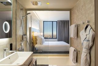 In the bedrooms, CUT Architectures have achieved a weightless feeling of freedom and fluidity The assemblage of bespoke furniture is both practical and functional, combining terrazzo with walnut veneer. The yellow and ocher color scheme is intended to bring visitors back to Earth, while Art Deco style lights call to mind the jazz and parties of the Montparnasse neighborhood's glorious past. Just off the bedroom, the bathroom incorporates a walk-in shower or a relaxing bath that offers a clear view over Paris, depending on the room category. Digital, circular lighting integrated into the mirrors and the CO Bigelow line of products ensure that caring for one's appearance remains effortless.