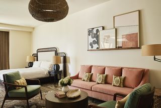 Available for the public to book, the third and fourth floors present 35 expansive all-suite hotel rooms, starting from 750 sq. ft. Each suite features separate seating and dining areas with details such as white oak, 40-inch tables. A delicate partition with a three-way dressing mirror divides the space to create a dressing area with antique armoires for discreet clothing storage. Rooms are filled with light and bright tones, exuding a large-scale residential feeling. Hand-glazed ceramic lamps sit above the nightstands and a hyper-local mini bar is available with curated partners such as AMASS (whose natural botanica gin is crafted in Downtown L.A) and MAUDE (the sexual wellness brand under the co-creative direction of Dakota Johson). The bathrooms feature custom vanities and french fixtures as well as toiletries from sustainable wellness brand, UNI. During their stay, hotel guests become temporary members and are able to access all facilities and programming at The Aster.