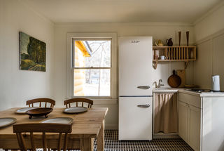 Situated at the Northeast entrance of the property is Casa Susanna, Camptown's year-round Mexican restaurant and social hub. Housed in a dark brown lodge illuminated by a neon green "Susanna" sign, the tavern-style restaurant & bar has been carefully restored by Ramshackle Studio. Upon entering Casa Susanna, guests are invited into the bar area featuring a large horseshoe-shaped bar with a cognac leather top and an oak dowel bar front, sculptural French oak bar stools from the 1960's, seagrass wallpaper, and a Shaker sewing table-inspired cherry back bar custom designed by Ramshackle Studio. A wine pantry, located right off the bar, houses a thoughtfully chosen selection of off
