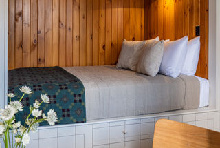 Camptown offers 50 unique accommodations sprawled across a renovated motor lodge with 24 guest rooms and 26 standalone log cabins. Guest room categories vary from cozy Nook Rooms to spacious Kings. Inspired by the original charm of the property and the nature that surrounds it, Ramshackle Studio has thoughtfully transformed each of the guest rooms and cabins, outfitting the interiors with a mix of modern and vintage furniture including wooden spindle bed frames with flanking nightstands, Shaker-style nook beds with built-in shelves and drawers, and found lamps, artwork and wares. Sprinkled sporadically throughout the property, the cabins at Camptown are each unique in character and design and have been painted using a considered color palette of bold earth tones from dark green and brown to yellow and red. No two cabins are the same as some interiors were completely renovated to evoke a clean, modern feel, while others were lightly restored back to their original condition. The cabins offer guests an enhanced hospitality experience with scenic views and additional privacy. A selection of cabins feature wood-burning stoves, a living area and / or kitchenettes fully equipped with a refrigerator, sink, stovetop, utensils and cookware, making them equally suited for short visits and long-term stays. A "Fill Your Fridge" produce drop-off option is available for guests