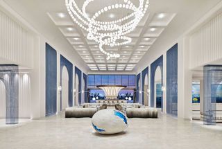 Upon entering the hotel lobby, guests are greeted by a blue-green sculpture crafted from coloured resin, with intricate patterns representing the mermaid's underwater home. Above the sculpture, pearl-shaped chandeliers and wall decorations featuring coral and seashells mimic an underwater wonderland.
