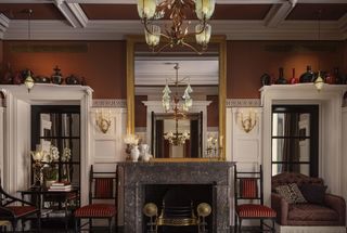Upon entering One Sloane, atmospheric lighting draws the eye to intricate ceiling cornices, wood wall panelling, stained-glass windows and playful trompe l'oeil. Neo-Greek friezes adorn the vestibule decorated with mosaics and vases. Chandeliers suspend from a painted stormy skied ceiling, emblematic of over 700 lights throughout the hotel, a mixture of original Benson lamps or faithful recreations. Beauty is abundant: Greek vases, antique chairs, curtains, rugs, mosaic tiling and cabinets decorate the lobby, home to a curated library.