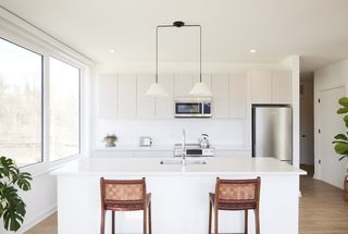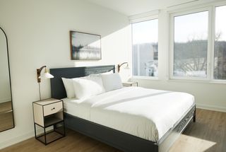 The apartment hotel units at ROOST Kelly Drive, designed in collaboration between Morris Adjmi and Method Studios, Method Co.'s in-house design firm, were created to serve as functional spaces with clean lines and subtle tones. A neutral color palette evokes a calm environment with muted wood flooring and millwork adding to the minimal aesthetic, while soft, color blocked furnishings imbue spaces with warmth and energy. Each apartment features large windows framing captivating views of the Schuylkill River and Falls Bridge, and full-size kitchens with modern appliances, spacious islands, and quartz countertops. The living experience is enhanced by ample bathroom vanity storage, fully tiled showers & baths, and generous closet space, complemented by high-design furnishings from Audo, Gubi, Industry West, and Schoolhouse.