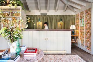 Sitting on a winding stretch of Sunset Boulevard, just west of The Getty Center and slightly north of the bustling and charming enclave of Brentwood Village, Le Petit Pali Brentwood is a 25-room hotel completely reimagined by Brosh and the Palisociety in-house design team. The exterior is anchored by a classic center court layout with four guest room buildings surrounding a central parking area, each painted Le Petit Pali's signature shades of white and deep, dark green and adorned with brass accent lighting, potted olive trees, jasmine and cypress trees.