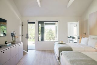 Rooted in a philosophy of garden-fresh interiors, each space is inspired by nature. The Guest House features five different guest room types, ranging from standard to a two-bedroom suite, starting at $495. Rooms feature organic details like pebble-inspired lighting, ash wood floors, and textured clay tiles paired with a soft, natural color palette drawn directly from the environment. Window benches invite quiet moments of reflection, while every room opens to a private garden, reinforcing the seamless connection between inside and out. Vaulted ceilings, ample storage and secondary vanity spaces that extend the bathroom add to the sense of openness and calm. The Barn, The Gardens, and The Guest House cultivate an appreciation for simpler, meaningful experiences through regional design influence with a modern touch.