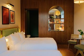 Each room begins with a rich green vestibule and millwork threshold that leads to the main living area, where cozy banquettes and custom wood-and-velvet headboards add tactile layers. An arched millwork minibar, topped with marble and stocked with a curated selection of drinks, nods to the hotel's cocktail-forward ethos. Bathrooms, meanwhile, are characterized by curved shower entries, handmade Moroccan tiles, and red marble vanities.