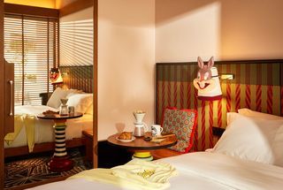 Mama Shelter Singapore is home to 115 guest rooms, all designed with comfort, cleverness and character in mind. Concrete walls are softened by patterned textiles and woven headboards. Carpets are inspired by Peranakan motifs, sheer lampshades contrasting with the occasional Bugs Bunny mask. The brand's first-ever bunk bedroom makes its debut here, ideal for families or groups of friends. All rooms come with five-star bedding, 100 percent satin cotton sheets, soundproofing, large screens with films on demand, and bathroom amenities by Ink & Water, an Australian brand known for its clean, cruelty-free formulations.
