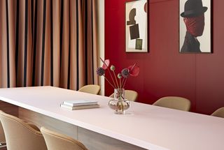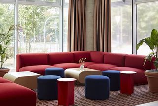 The interior design combines burgundy and camel tones with touches of blue, complemented by lamps and artwork by Verner Panton. On the ground floor, an open lounge and co-working space are available for working or relaxing.