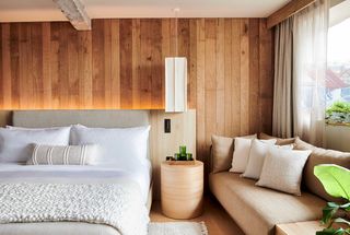 The hotel's outdoor terraces are designed as green sanctuaries filled with wildflowers and seasonal herbs like peppermint, marjoram, thyme, and lavender. A dramatic living wall brings a lush, biophilic element to the façade, offering a connection to nature while adding greenery to the cityscape. And an onsite bee hotel sheds light on the importance of urban pollinators and the role they play in local ecosystems.