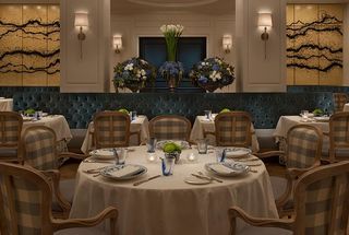 The newly designed restaurant introduces a transitional style that blends The Peninsula's signature French-country look with updated, contemporary accents. Deep-tufted booths and banquettes offer sumptuous seating and dining tables are dressed with Parisian-inspired blue and white Toile de Jouy table skirts topped with crisp white linen. Luxurious natural white oak floors are the canvas for a delicate interlacing geometric pattern, an exquisite accent to the new space.