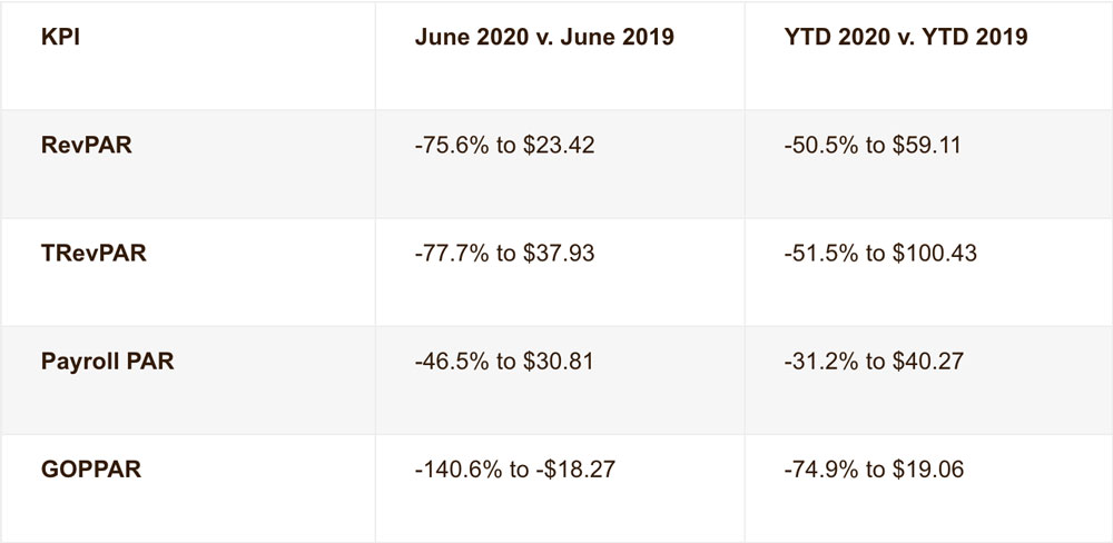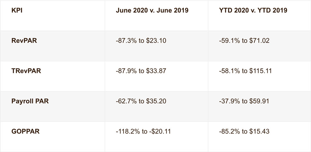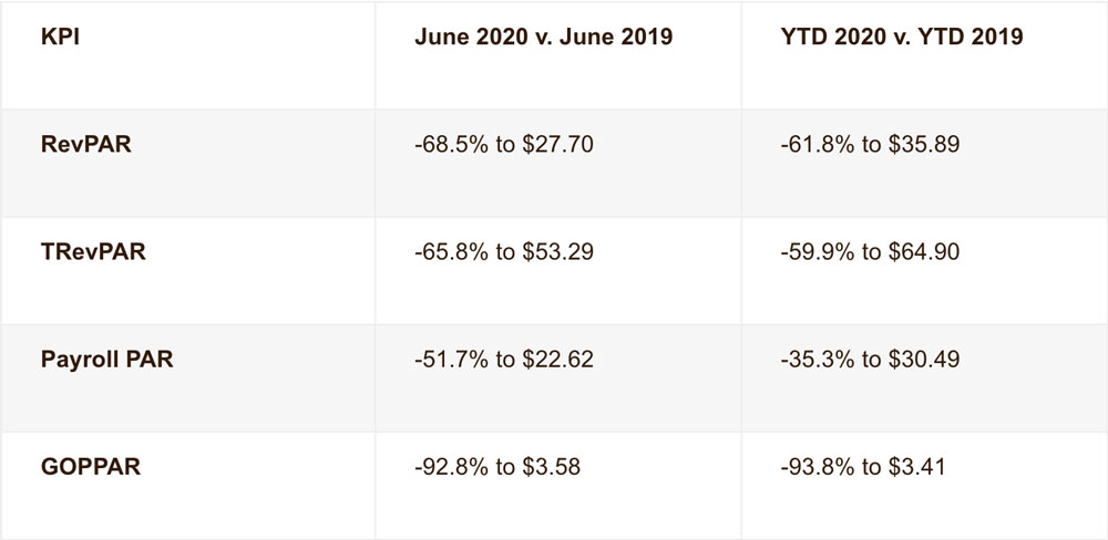 Like RevPAR, TRevPAR saw a slight increase in June over May, up 5.3%, but off 55% from March. The small rise in total revenue was bolstered by an uptick in total F&B revenue, which climbed to a double-digit dollar amount, the first time it's been in that territory also since March.