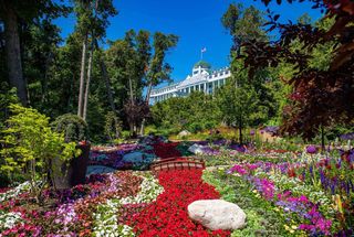 Any tour of the extensive gardens at Grand Hotel on Mackinac Island, Michigan, should always begin with the flower beds of the world-famous front porch. Measuring 660 feet long, it is the world's longest front porch, and it is lined from one end to the other with signature Americana Red Geraniums: 1,375 geraniums in 147 planting boxes and 12 yards of planting soil. Grand Hotel uses more than 2,500 geraniums in all its flower beds. Designated a National Historic Landmark by the U.S. Secretary of the Interior, Grand Hotel's grounds feature over 25 gardens that account for more than one and a half acres of maintained garden beds. Other gardens that can be seen from the front porch include the Tea Garden right below the hotel. The Tea Garden is home to the beautiful historic English stone fountain, horse and carriage topiary and a historic meandering stone wall lined with cedars and gardens. The Wedding Garden is adjacent to the Tea Garden, and roses line the west path to the pool and wooded areas. The Triangle Gardens are viewed walking up the hotel and are the most photographed of all the gardens. Guests should walk and view the East and West Garden Beds, The Labyrinth, which is hidden adjacent to the pool, and the Pool Gardens. Margaret's Garden serves as the hotel's flower shop and provides fresh flowers throughout the hotel and for special occasions daily. The majority of the gardens and surrounding areas have matured over the 135 years Grand Hotel has been established as “America's Summer Place.”