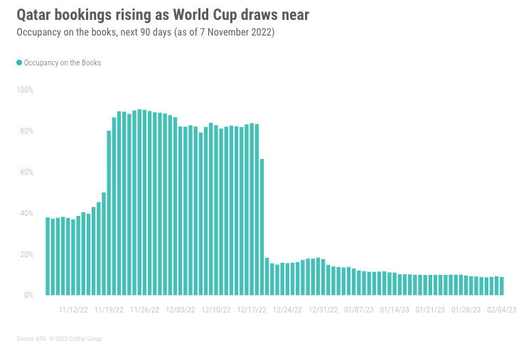 The latest data, however, shows occupancy on the books averaging 85% during the event period, with the metric dropping no lower than 66.3% and peaking at 90.5% on 25 November – the day host Qatar takes on Senegal and the U.S. competes against England. The second-highest occupancy-on-the-books level (90.2%) occurs on 26 November, when neighboring Saudi Arabia faces Poland, and Argentina matches up with Mexico.