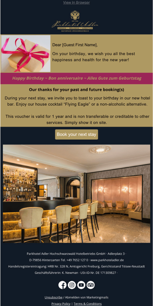 The hotel’s focus on guest data has transformed its marketing program. With highly segmented campaigns, average email open rates are 63%, and average room revenue per campaign is more than €28K. The hotel leverages out-of-the-box automation in Revinate Marketing to create always-on campaigns like pre-arrival emails with upsells, birthday (featured to the right), and “we miss you” offers. All these campaigns drive significant revenue with no work after setting up the campaigns.