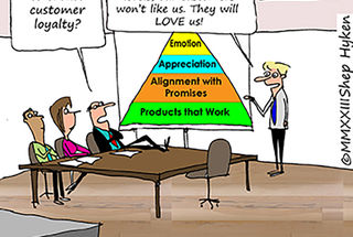 - Emotional Connection: This is where loyalty is created. Customers know your products work, trust you, align with your beliefs and what you stand for, and feel appreciated. In short, they like the way you make them feel. Maintain that feeling and build on it. Move them to feel good about your company, not just what you sell. This is what helps drive customer loyalty.