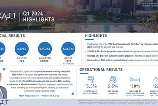 CHICAGO - Hyatt Hotels Corporation ("Hyatt" or the "Company") (NYSE: H) reported first quarter 2024 results. Highlights include: