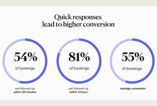 Speed pays off. Venues that respond within 30 minutes achieve a conversion rate of 60%. Wait a full day and that drops to 52%; after 24 hours, just 44%.