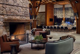 Flowing seamlessly from the Living Room Lodge, the hotel’s lobby bar and lounge has also undergone a striking transformation that balances rustic grandeur with high-end refinement. Moved to a new location in the lobby to maximize its experiential impact, the renovated bar is crowned by a cascading custom two-story chandelier, its crystalline drops reminiscent of the nearby frozen alpine waterfalls. The new U-shaped bar is an architectural statement in itself, thoughtfully orienting guests toward the hotel’s panoramic mountain backdrop framed by the lobby bar’s massive floor-to-ceiling windows, with architectural wood, stone, and metal converging in a palette of organic finishes echoing the natural materials beyond the glass.