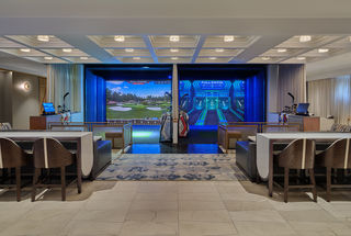 As part of the renovation, and in coordination with the interior design experts at Premier Design Studio, AXIS introduced the resort’s first Topgolf Swing Suites, creating a high-energy, design-driven lounge that marries interactive entertainment with luxury hospitality. Coffered ceilings, integrated lighting, and a sculpted open plan define zones for gameplay, socializing, and private gatherings. Bar-height communal tables, lounge seating, and soft rugs create layers of comfort and flexibility, while a recessed bar framed by a backlit arch offers a sophisticated focal point amid the excitement of play.