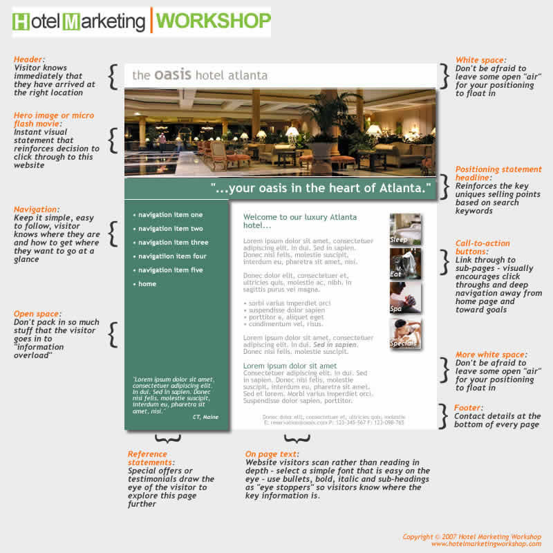 And as a final hint, use your common sense…you hotel website must be easy to build, easy to maintain or add to and compelling to visitors. If your website designer wants to take three months or more to design the “front end” and build the “back end” for your mid-size property, they are probably over-engineering it...from acceptance of design it should take no longer than a month to complete. Nowadays, they should be providing you with a website based on a Content Management System which will allow you to edit or add pages in-house quickly and easily…this will also reduce your ongoing costs. Finally, your website should indeed look smart and stylish…simple, fresh and not too busy…enough to capture visitors imagination without trying to do too much.