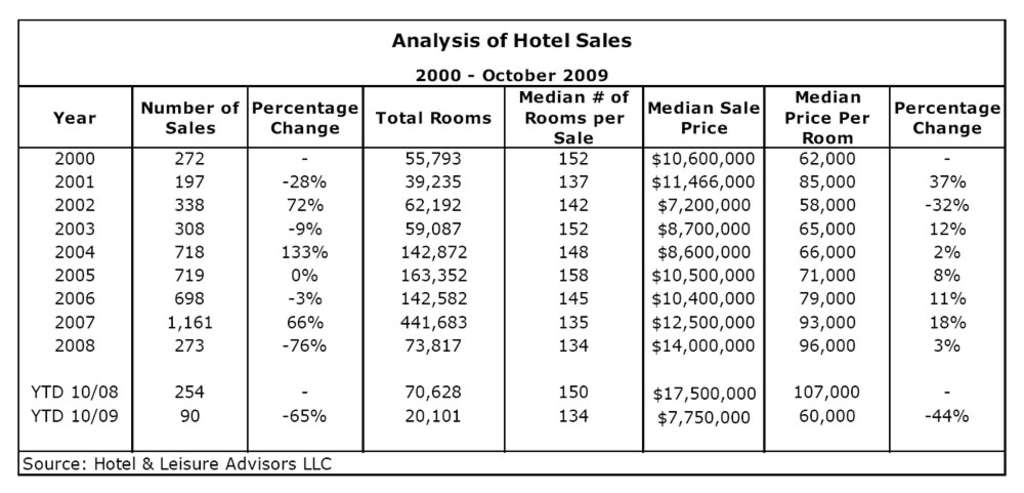 Hotel and Leisure Advisors has been tracking sales of hotel properties that have occurred since 2000. The following table from our database illustrates the hotel sales pattern over the past nine years and year-to-date through October 2009.