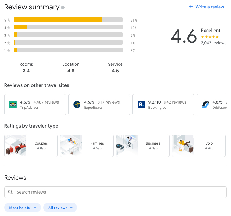 Now, when you click the Reviews tab on a Google hotel listing, you discover a treasure chest of review content and metrics. This includes ratings of the hotel's rooms, location and service and—yes, they're back—reviews from other sources, including TripAdvisor, online travel agencies and hotel brands.