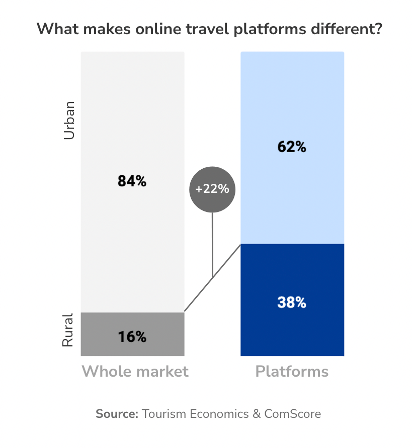 In 2019, only a small fraction of European accommodation sales went to rural areas (16%). Yet, when we talk about the share of total sales via online travel platforms, the number more than doubles (38%).